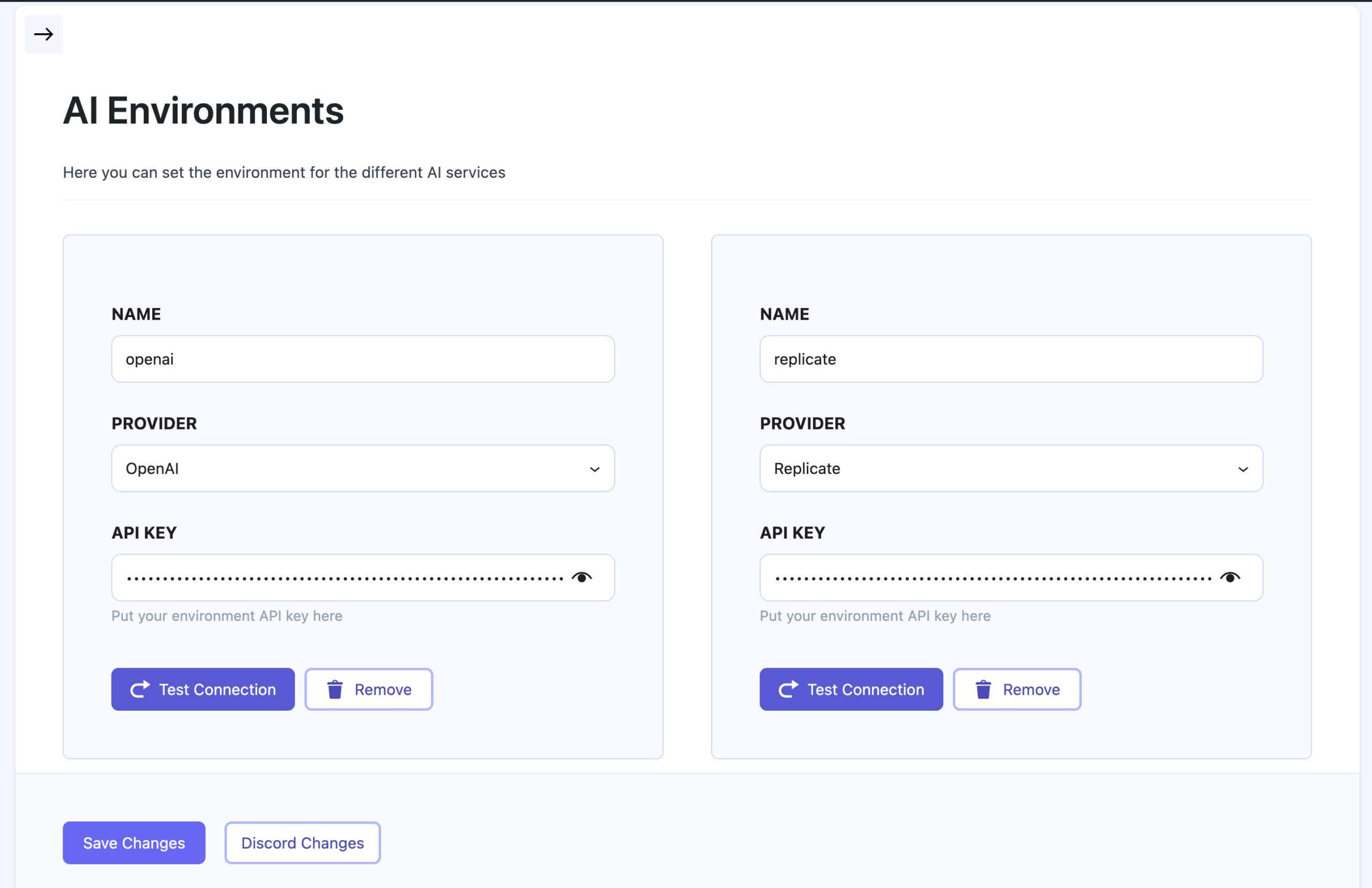 • AI Environments → In this page, you can set as many AI ENVs as you want. You have access to different AI providers like OpenAI, Replicate (we will add more providers soon!)