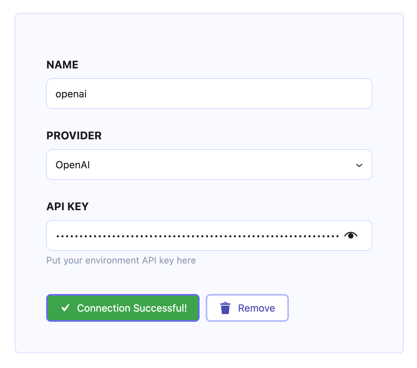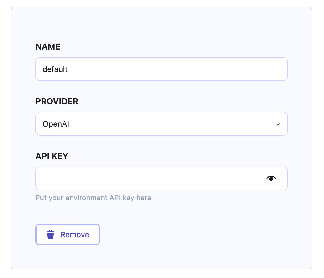 • Provider: Open the provider dropdown and choose the one for which you have the API key. We recommend starting with OpenAI.