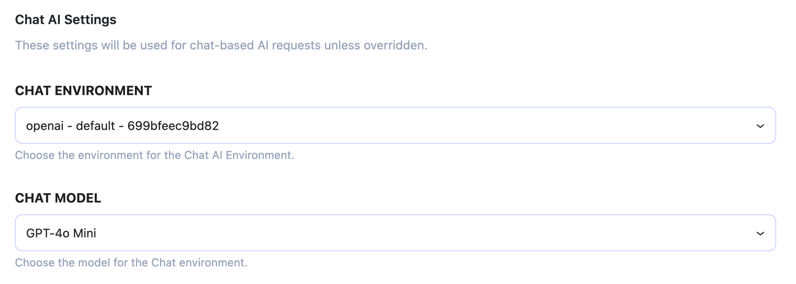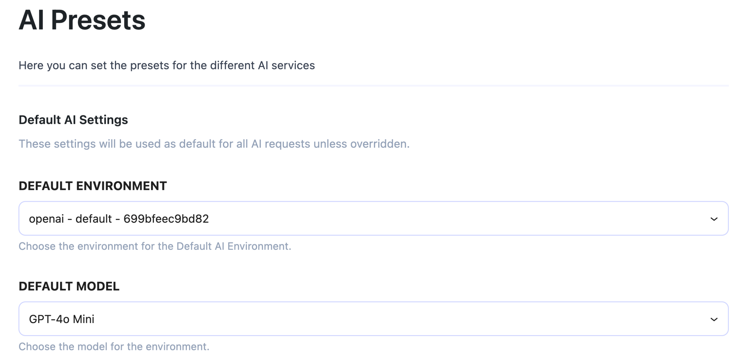 These settings will be used as the default for all AI requests unless overridden. This means, in all AI requests across all the AI Services and Features, we will first use the default presets, unless we override them in other settings.