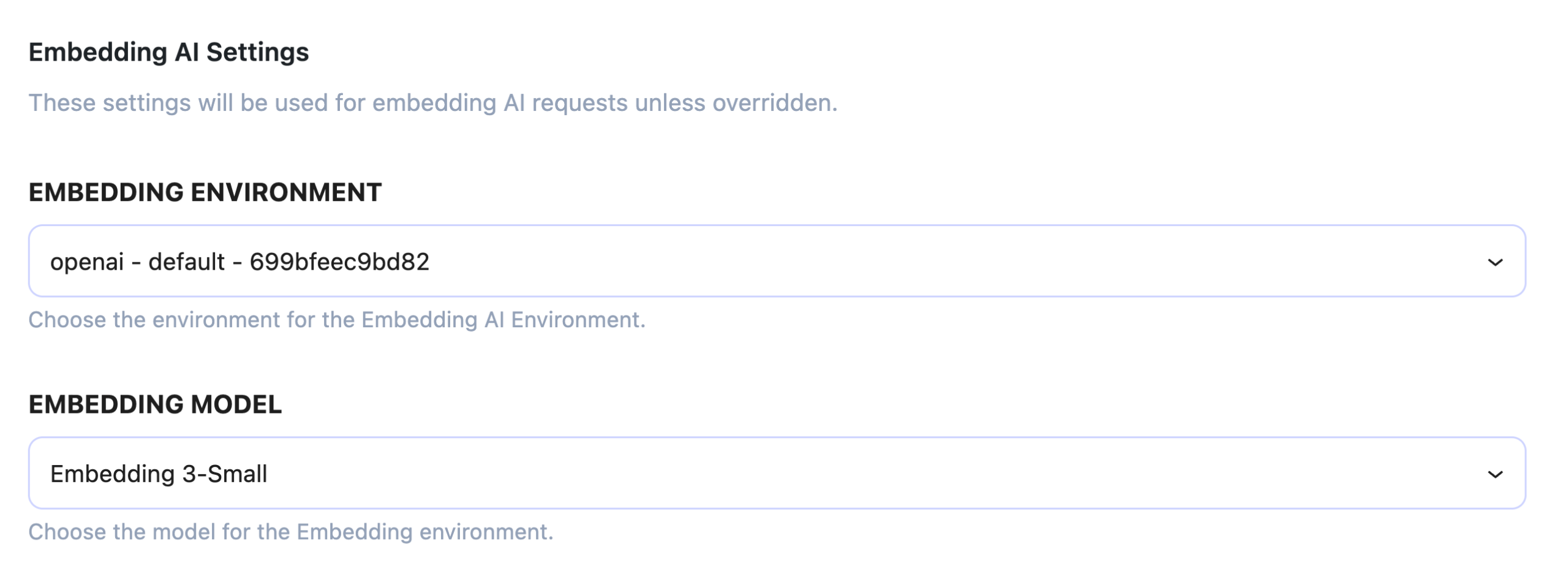 These settings will be used for AI embedding requests unless overridden. This means that all the AI embedding requests first will use this AI provider and model, unless we override/select a different configuration for that specific feature/widget.