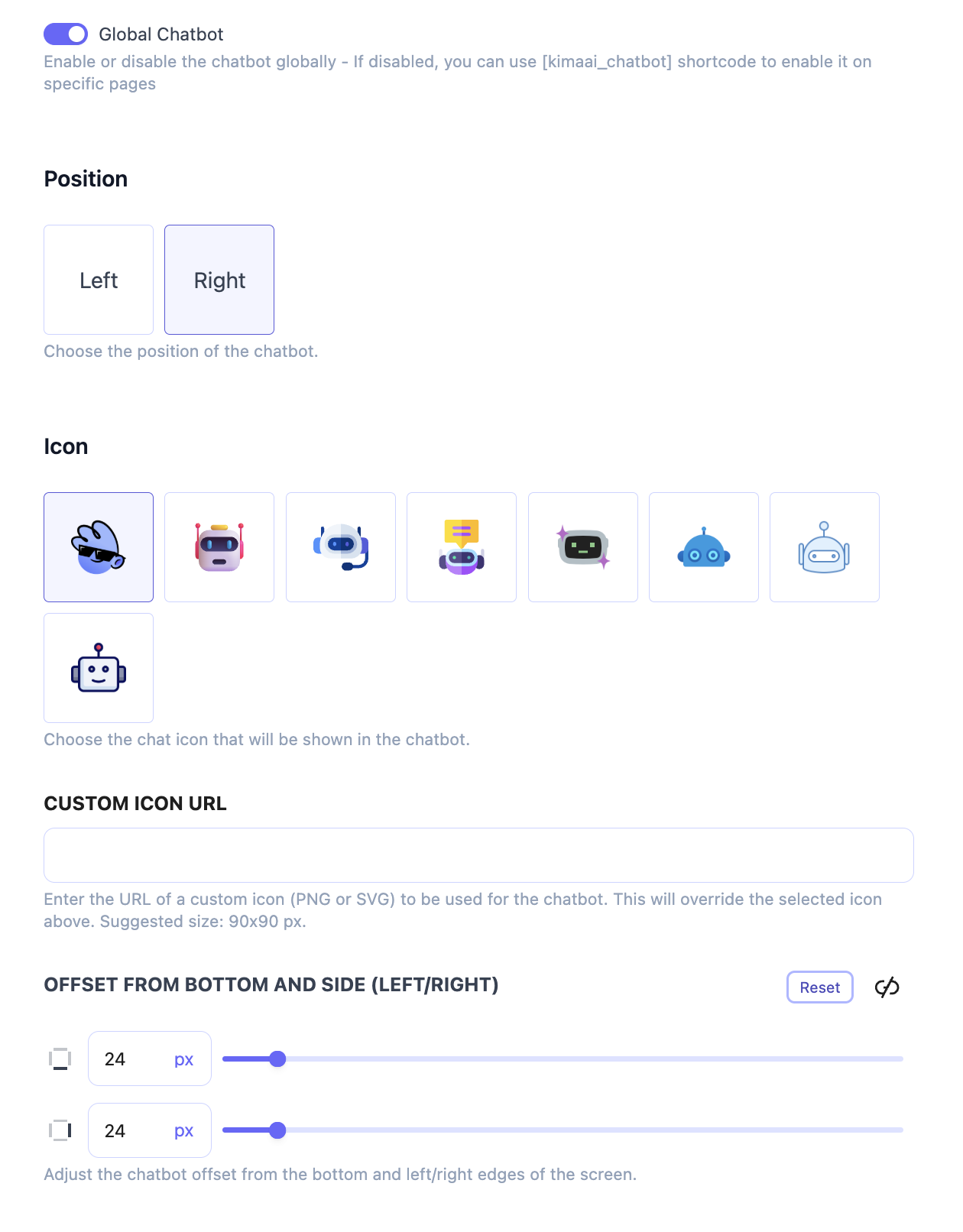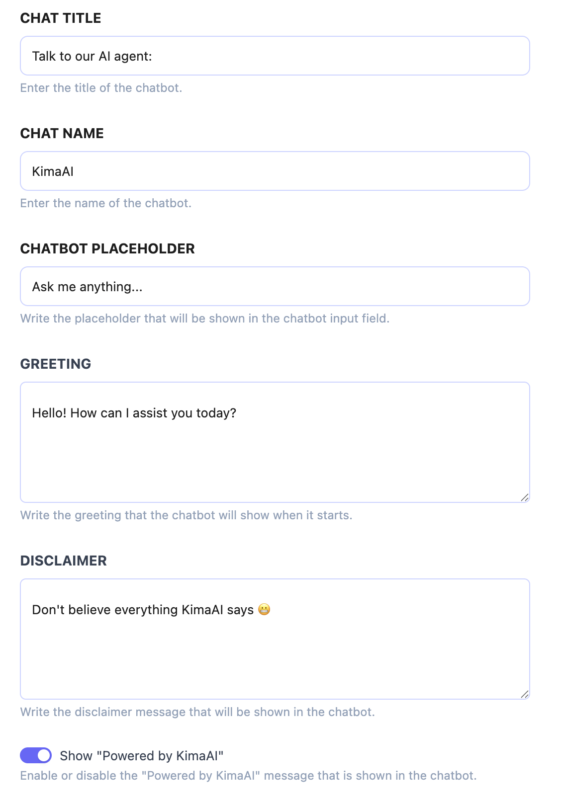 With this toggle you can enable or disable the chatbot globally – If disabled, you can use kimaai_chatbot shortcode to enable it on specific pages.