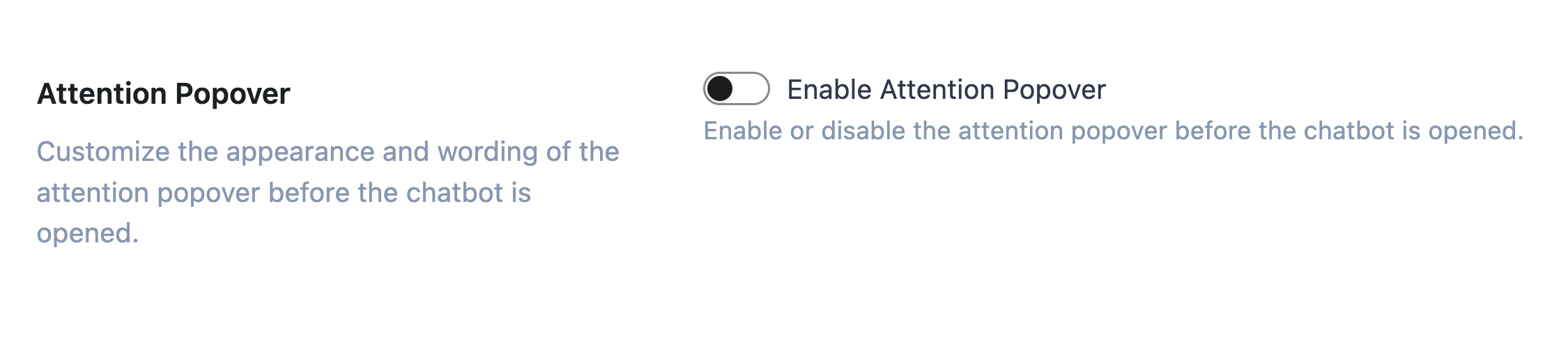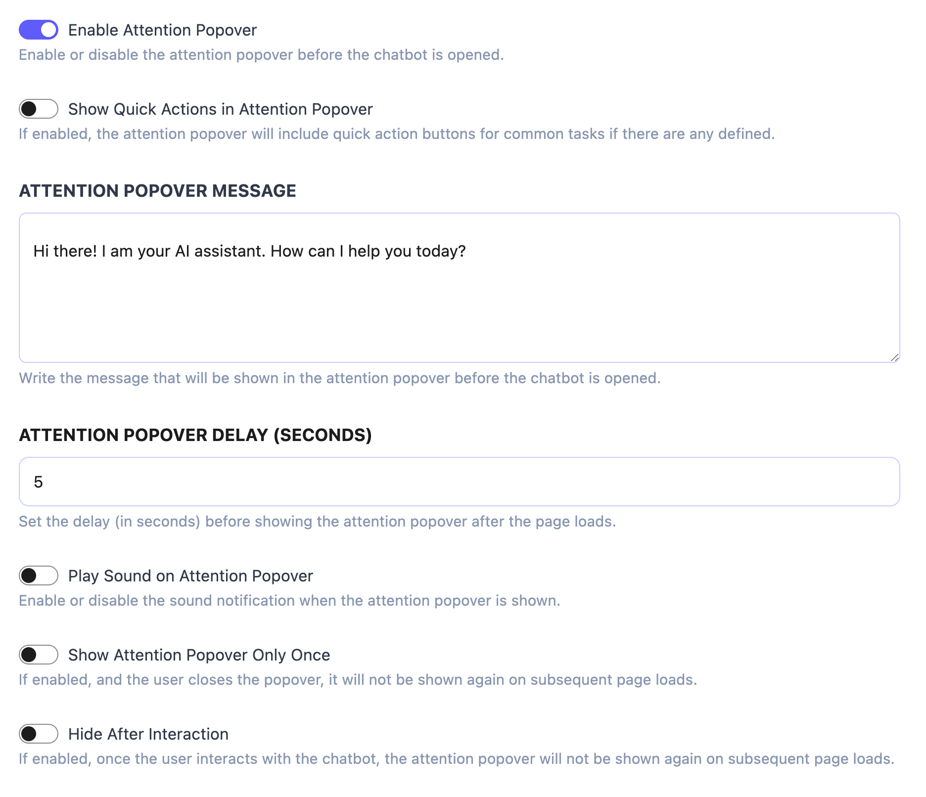 Before we get to know this setting section, I like to tell you why we implemented the Attention Popover for the Chatbot widget. To be honest, users tend to ignore almost every widget on a website, unless they really need them or they are aware of them, so with the Attention Popover feature, you can tell your users → Hey! There is a helpful and friendly AI assistant here! and it’s ready to help you with any issue you might have 😃