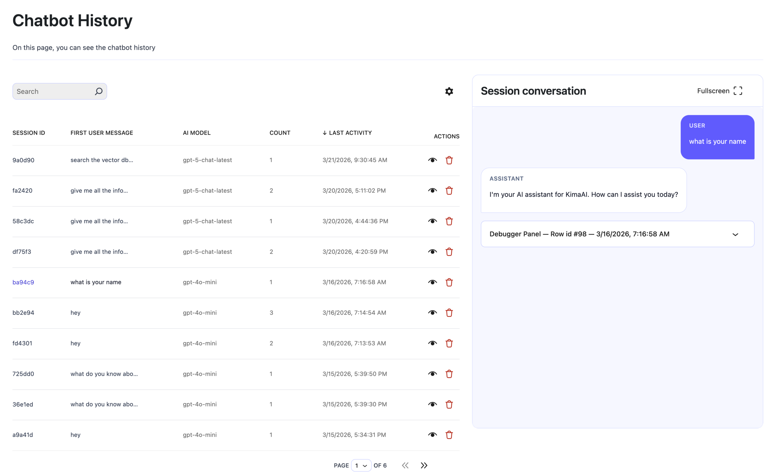 The Chatbot History Panel in the KimaAI dashboard is the admin area where you can review saved chatbot sessions, inspect full conversations, monitor models and token usage, and debug function/tool calls through overview data and raw request/response payloads.