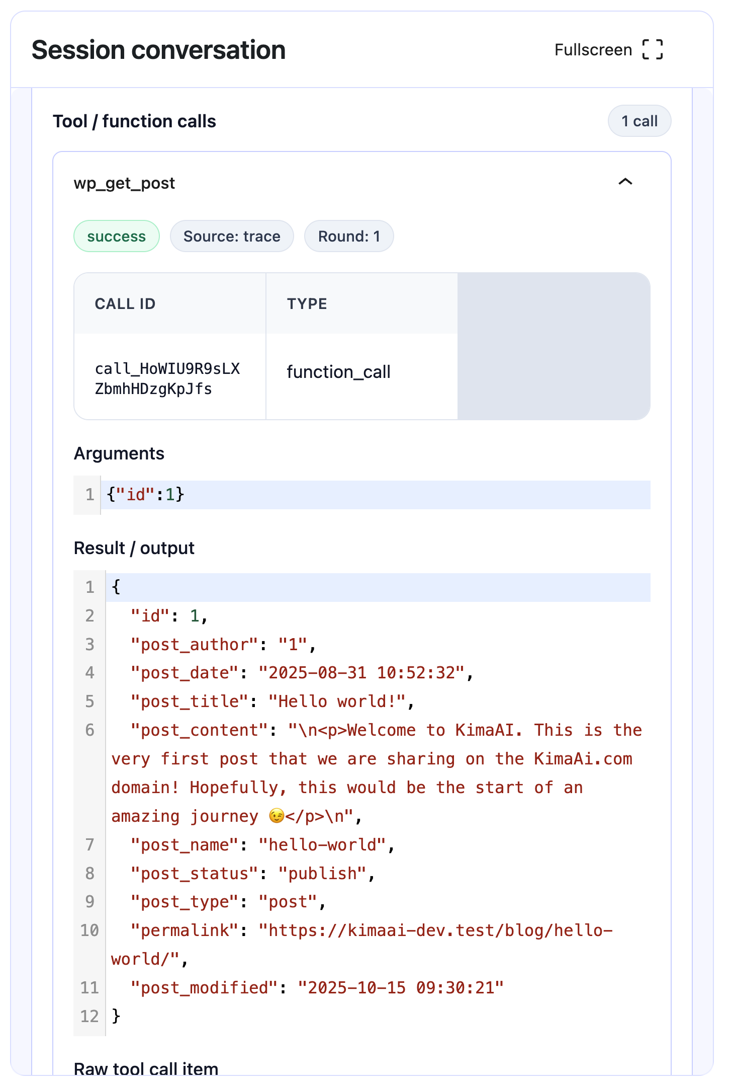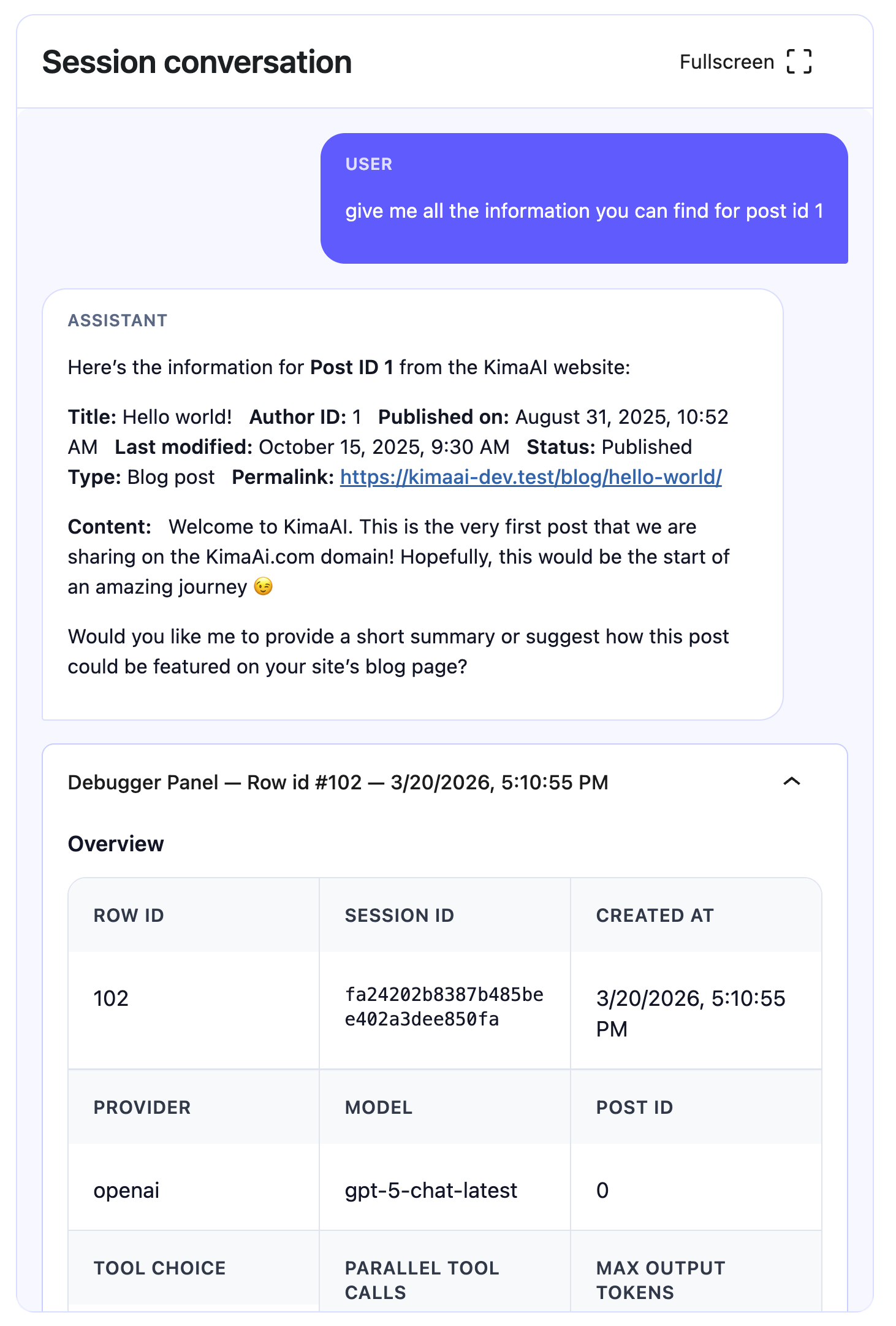 If the chatbot uses custom WordPress tools or data-fetching functions, you can inspect which tool was called and whether it behaved correctly.