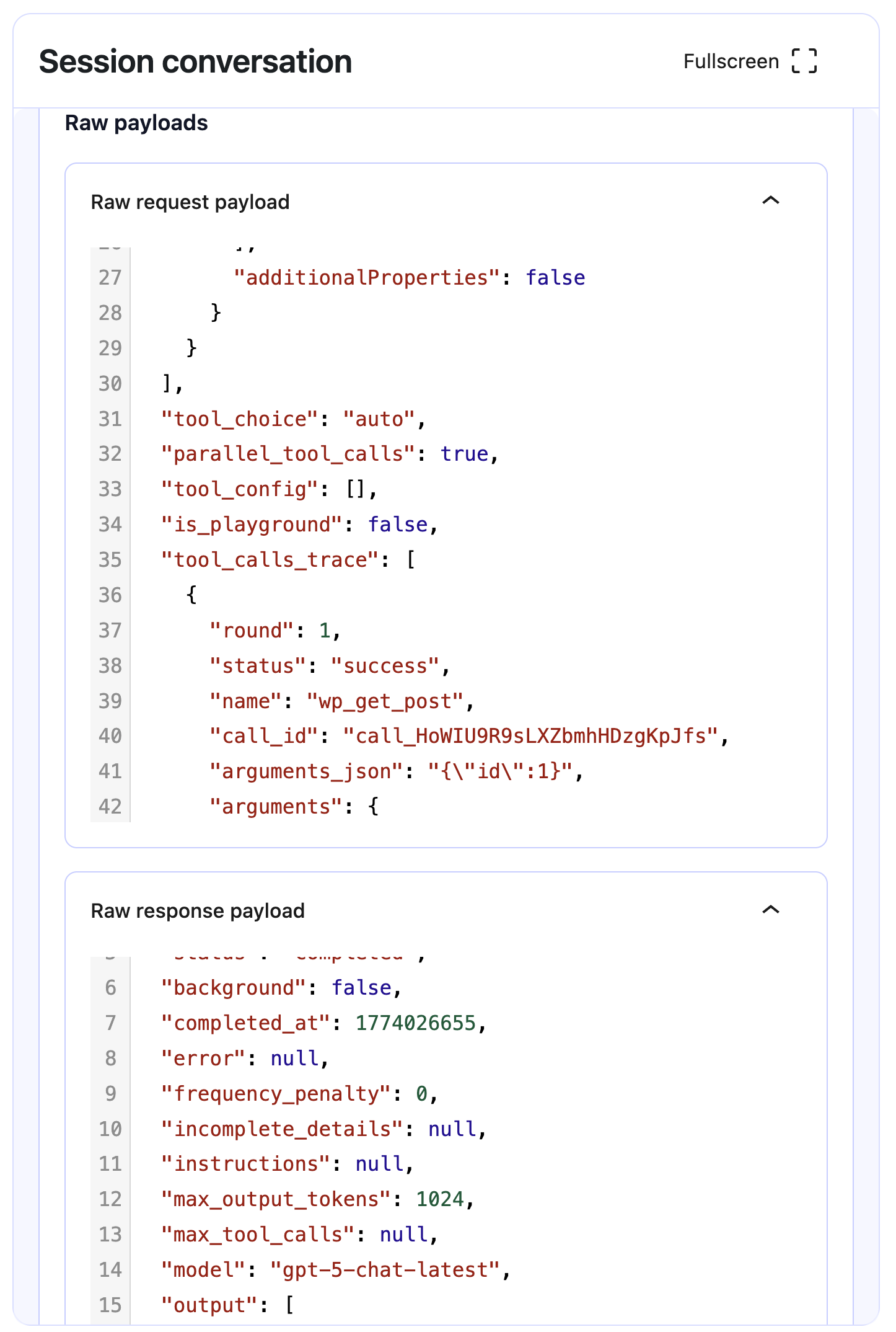 This is especially useful for developers, agencies, and advanced site owners. It helps diagnose prompt issues, malformed tool definitions, unexpected arguments, or response-shaping problems.