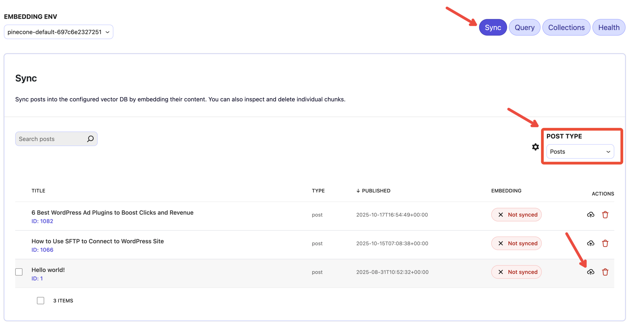 Now, click the “Sync” tab to open the embedding sync panel and start syncing data with the Vector DB.