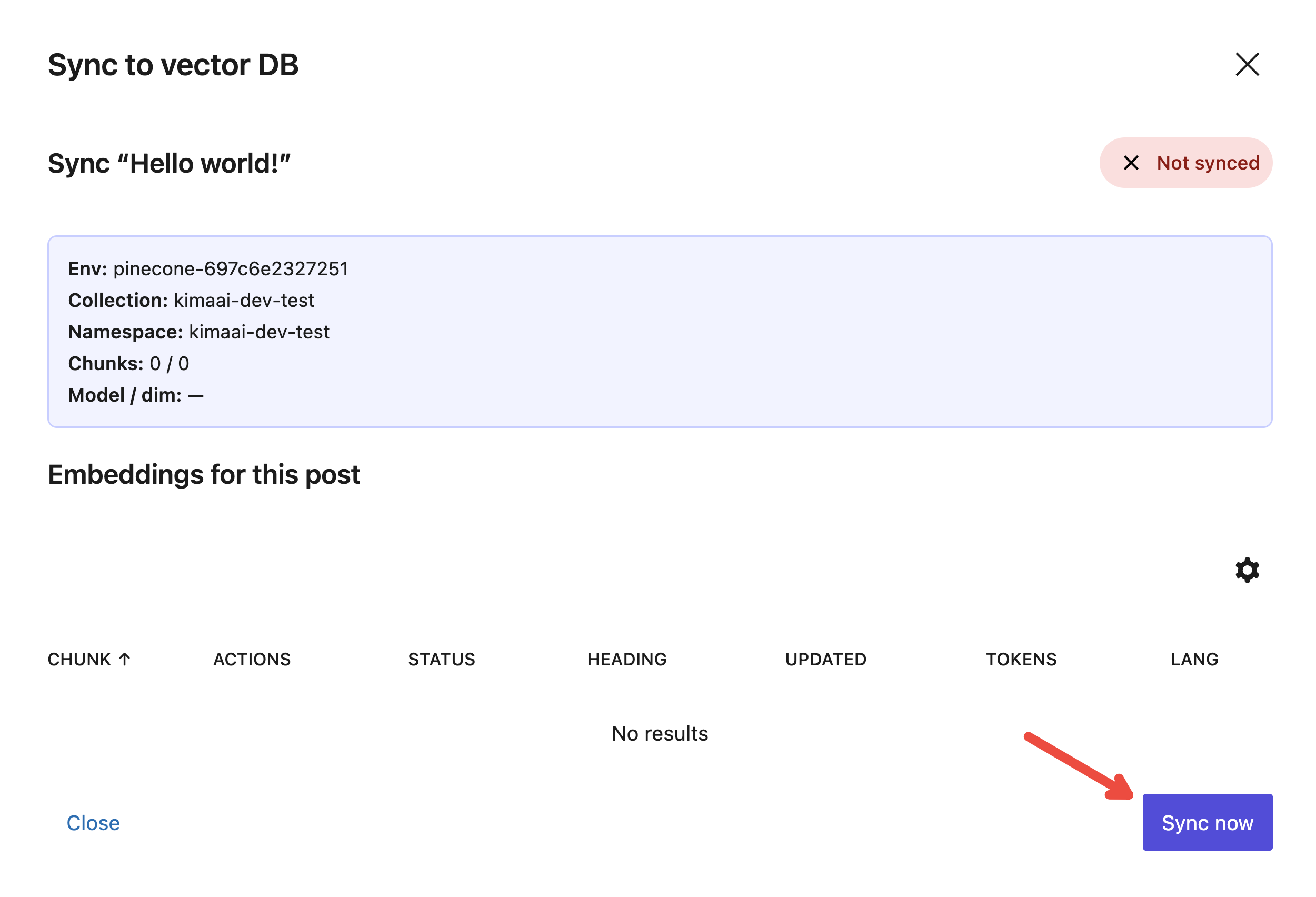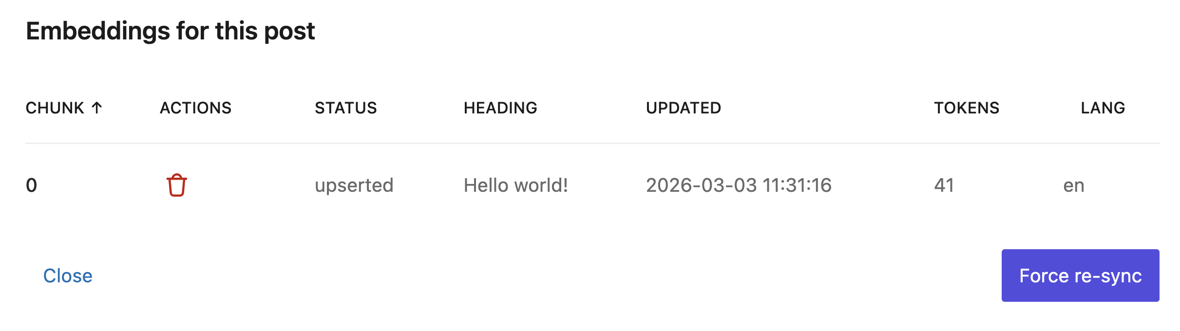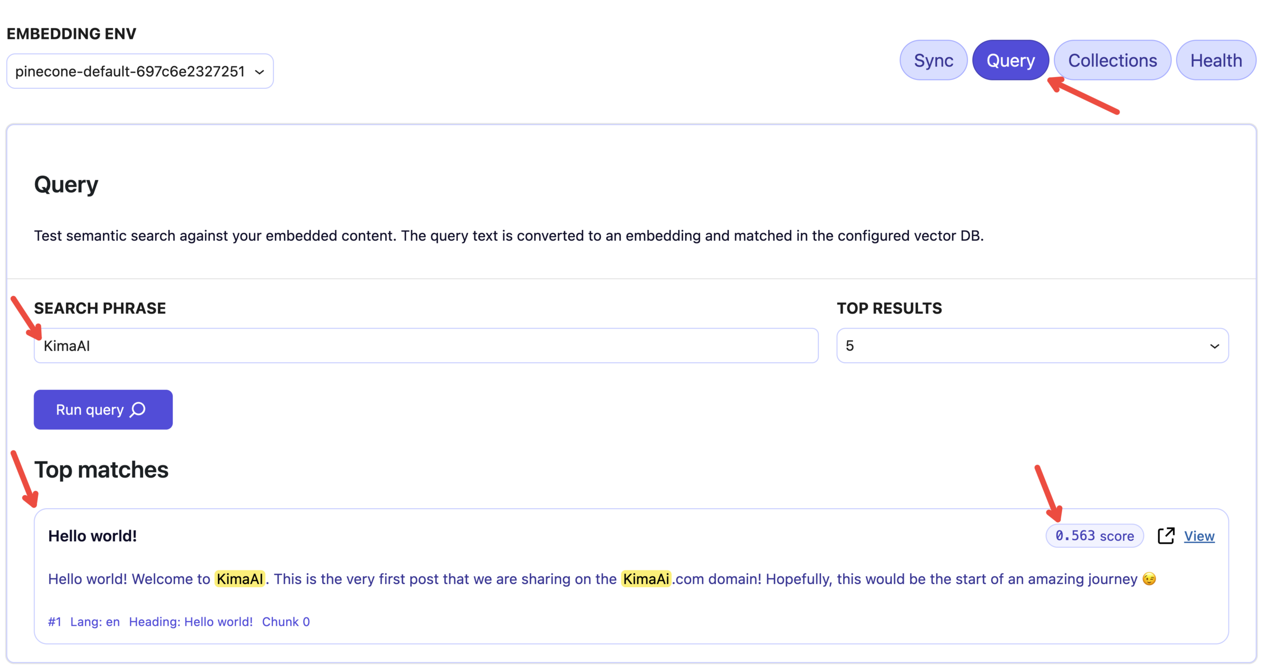 - Search phrase: Type a keyword that exists in the post that you just synced into the vector DB.
