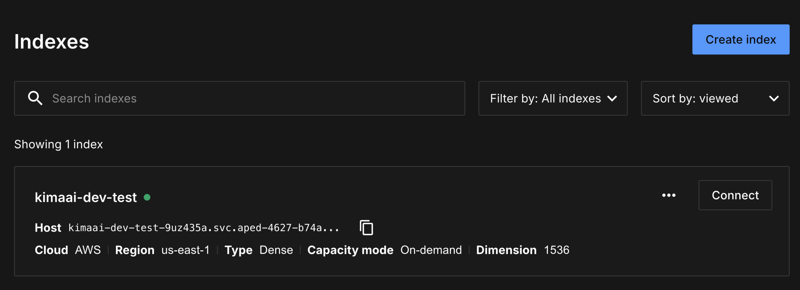 - In our case, we have a local dev with the domain: https://kimaai-dev.test, and as you can see, the index name is