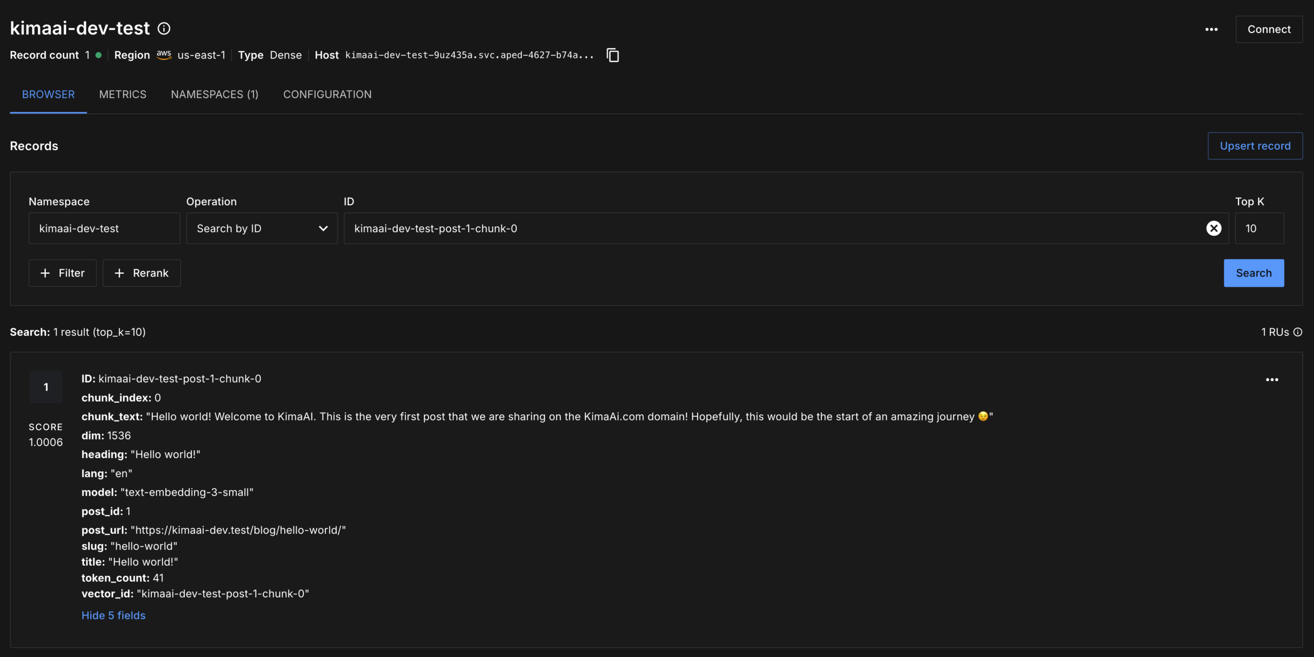 If you want to see the created embedding inside the Vector DB dashboard (in this case, Pinecone), log in to the dashboard and go to the respective index. As you can see in the screenshot below, there is only one record, and it includes all the necessary information, like ID, chunk_index, chunk_text, dim, etc.