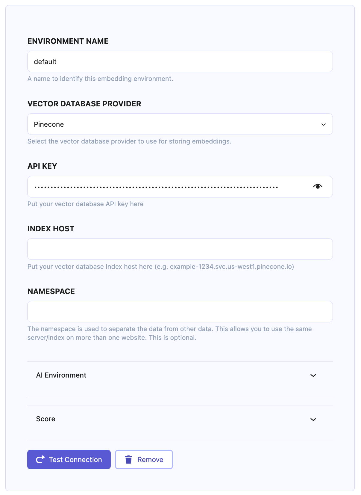 - Index Host: Put your vector database Index host here (e.g. example-1234.svc.us-west1.pinecone.io)