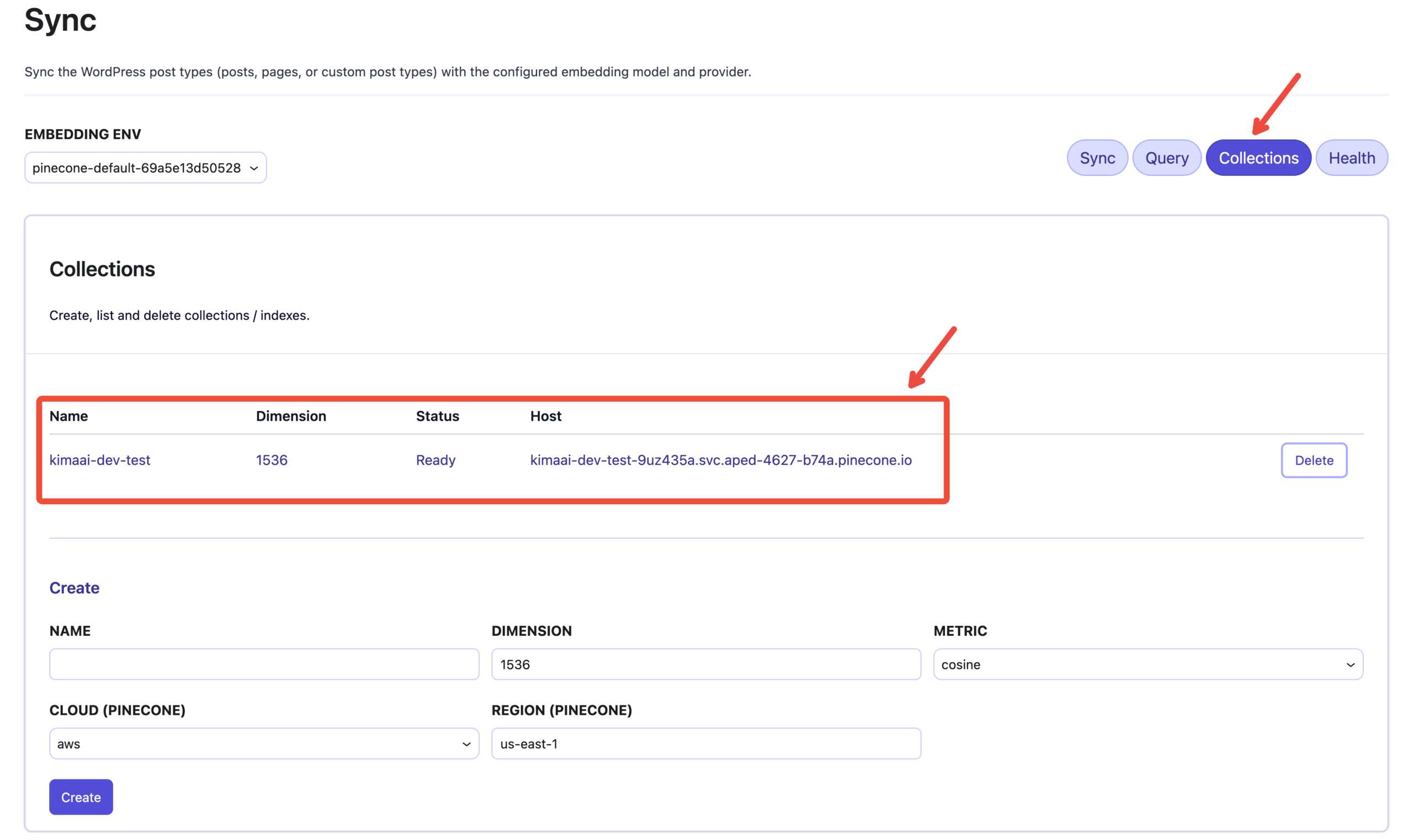 Now, navigate to WordPress dashboard → KimaAI Settings → Embedding → Sync → Collections.
