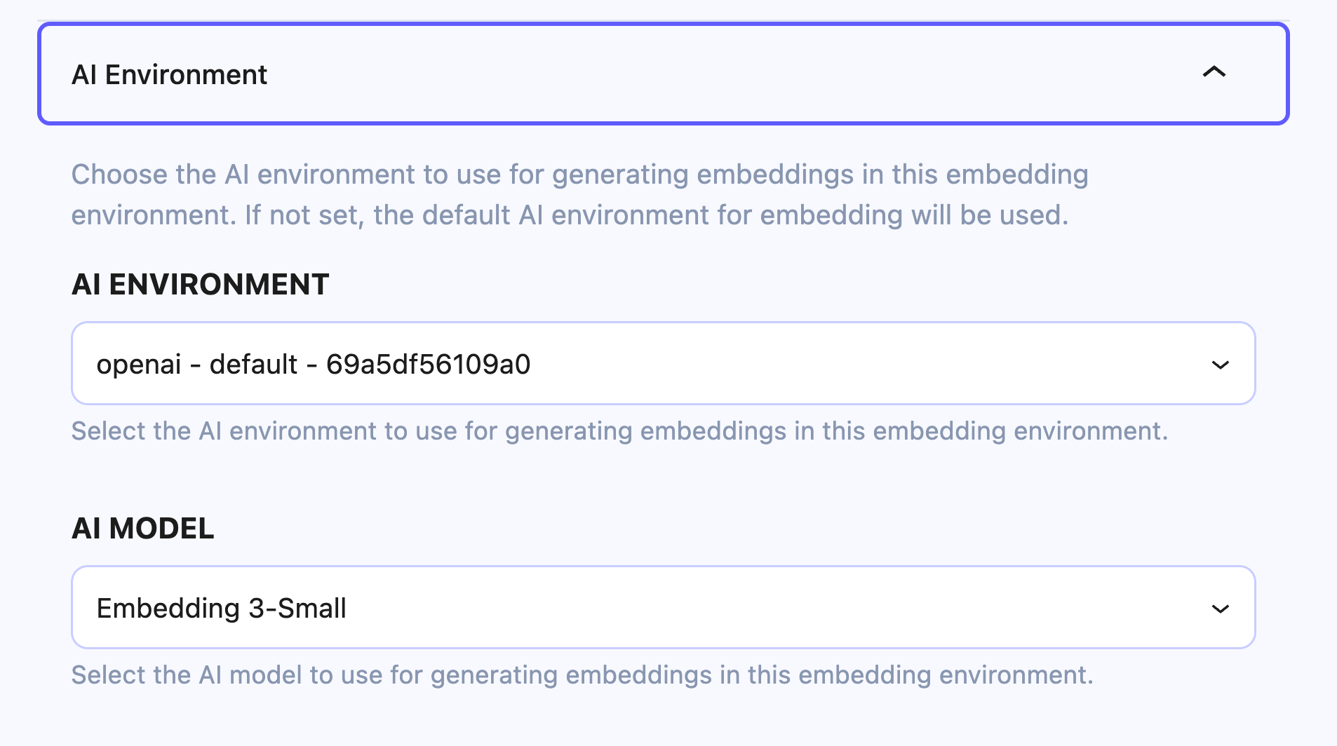 After you have configured the AI Service, it’s time to choose the AI Environment to use for generating embeddings in this embedding environment. Open up the AI Environment tab in the Embedding Environment settings, like the following: