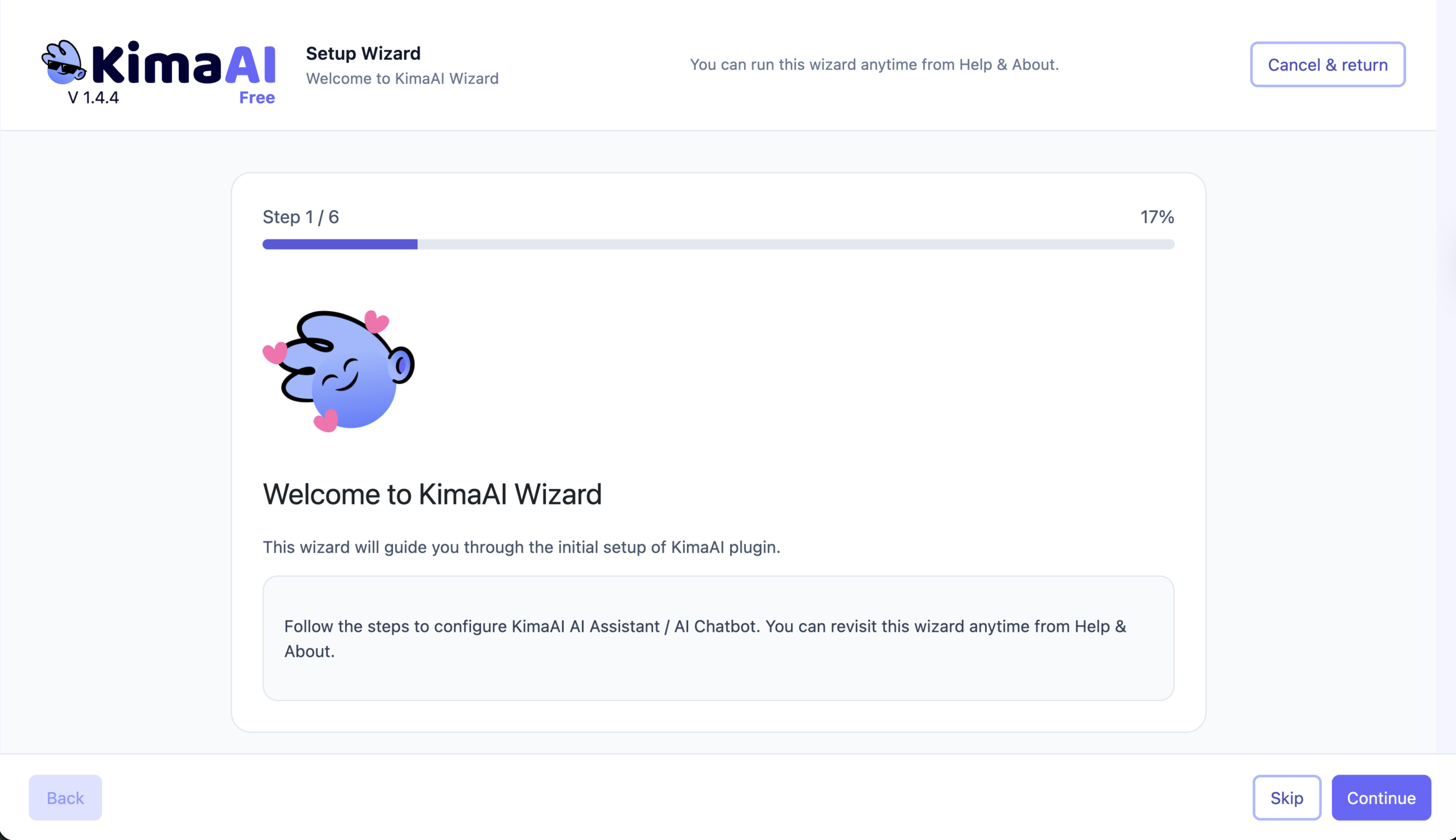 After you activate the plugin, the first thing you will see is the KimaAI setup wizard. We implemented this wizard to help you set up the chatbot as easily and as fast as possible!