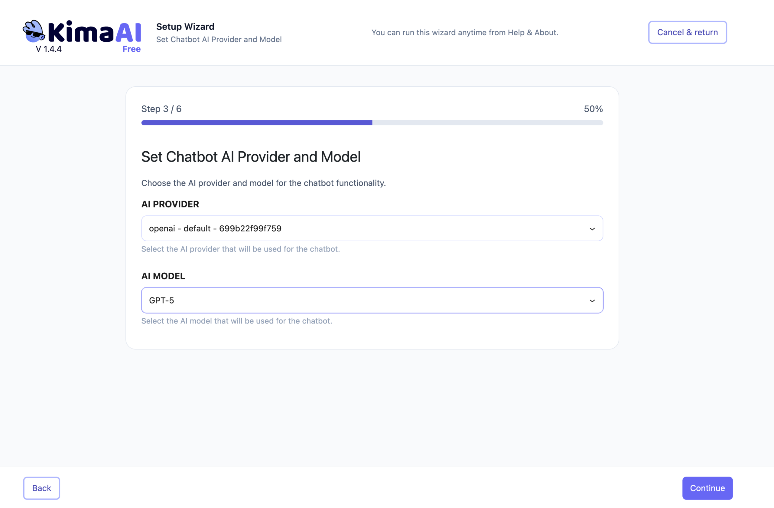 • Cancel & return → If you click on this one, then you will get back to the KimaAI settings dashboard.