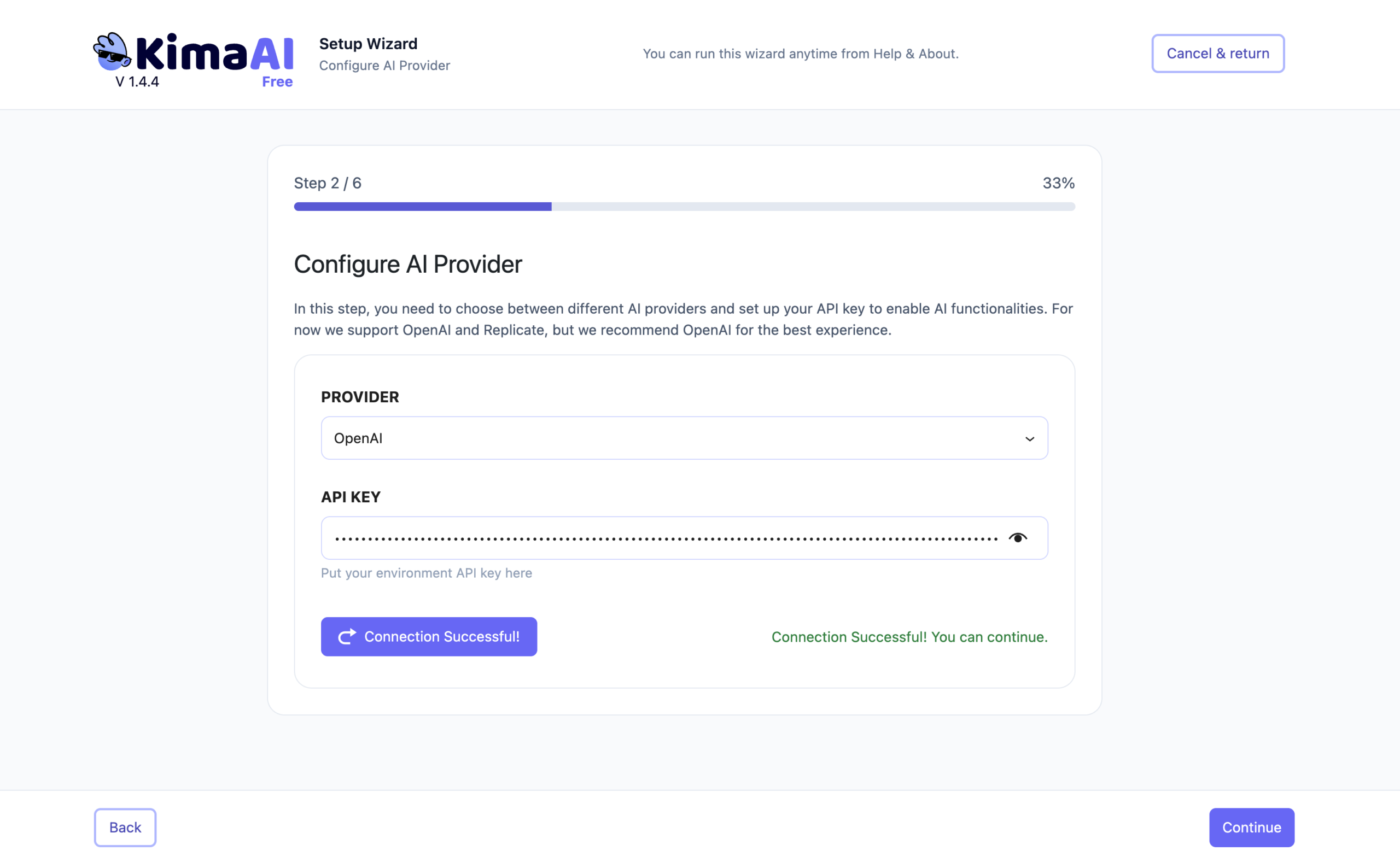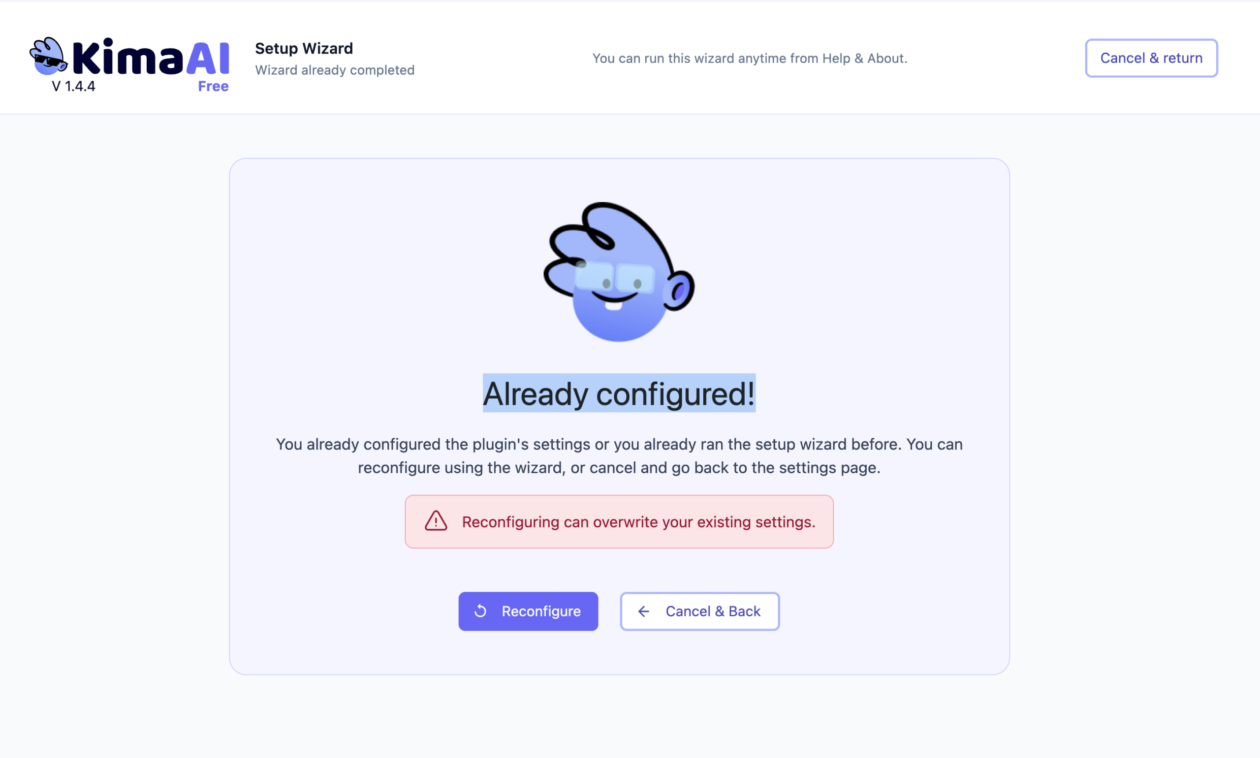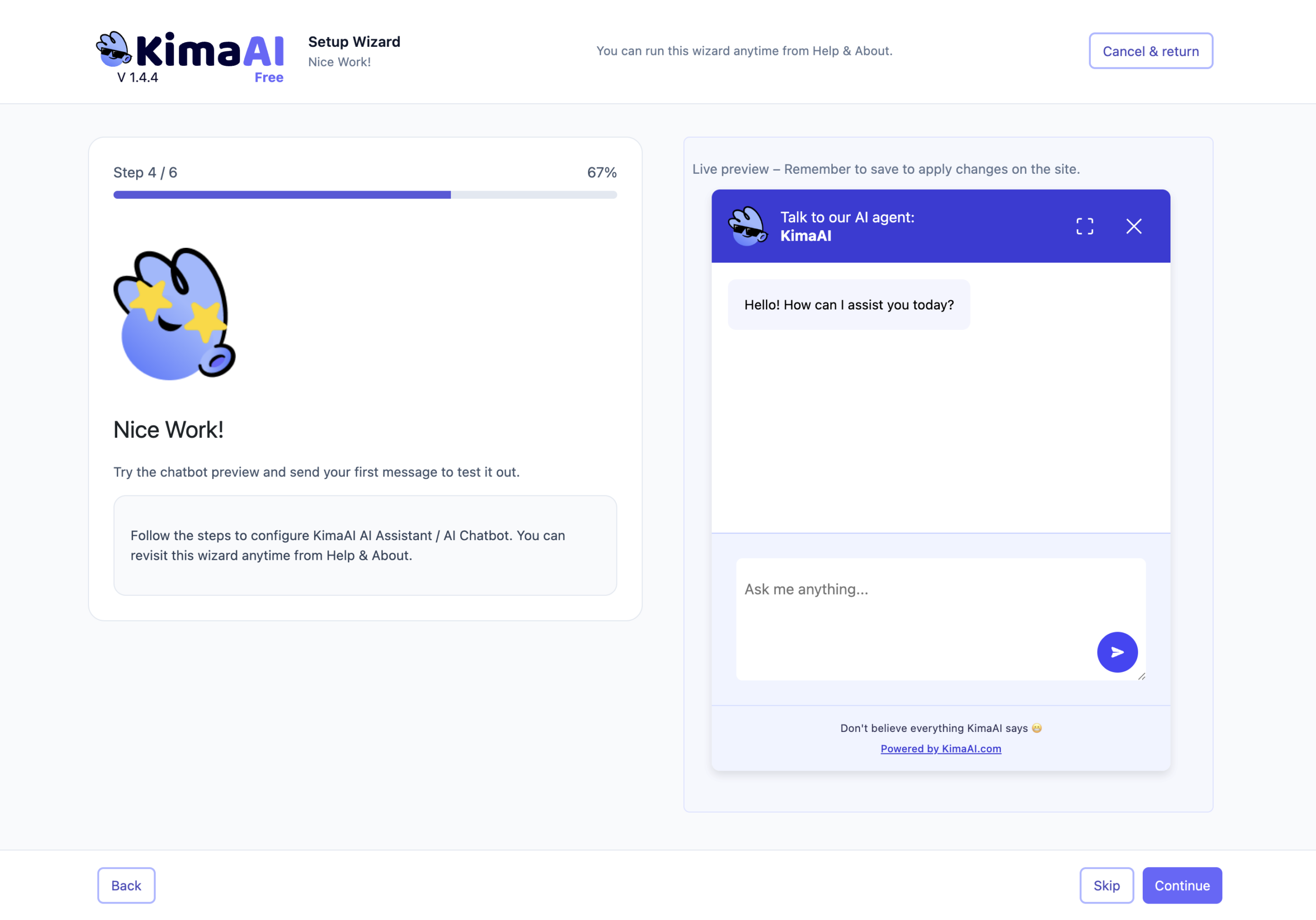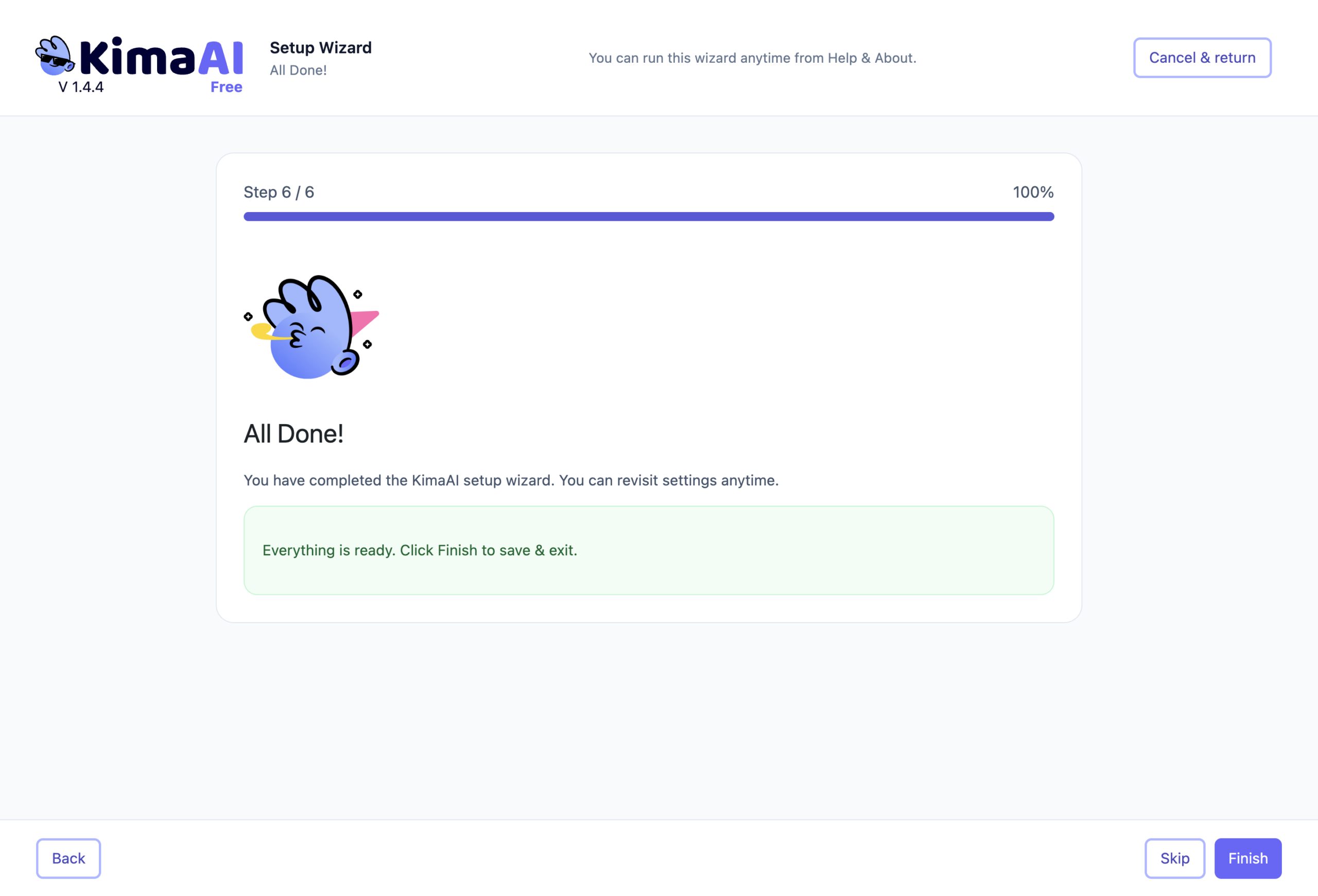 Congratulations! 🎉 You have completed the KimaAI setup wizard.