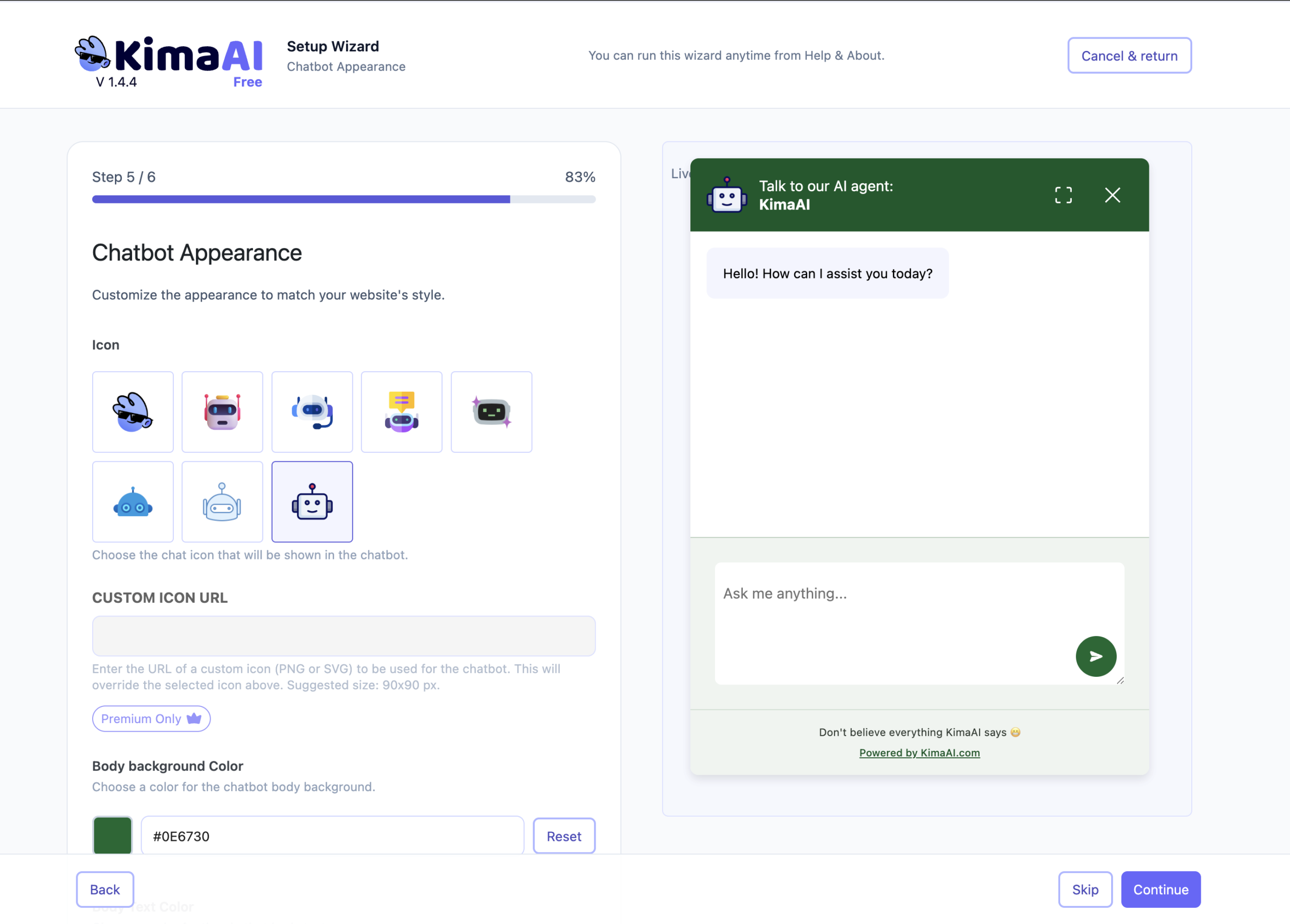 Now, jokes aside, on step 5, you can configure the chatbot’s appearance, you can change the chatbot icon, and the colors.